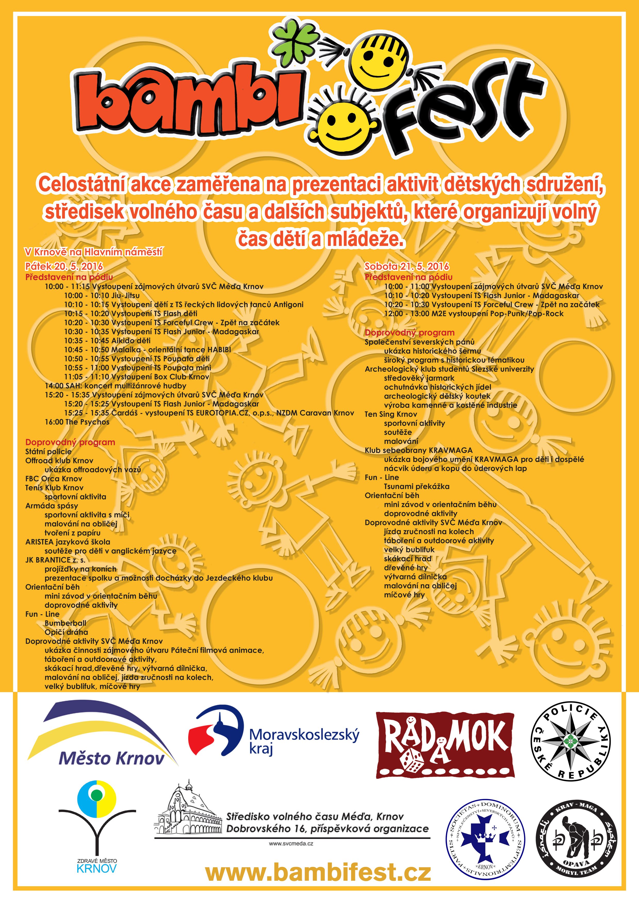 Srdečně zveme na Prezentaci aktivit dětských sdružení a středisek volného času Bambifest, který se uskuteční ve dnech 20.5. – 21.5.2016, který se uskuteční na krnovském Hlavním náměstí. V rámci Bambifestu proběhne v obou dnech vystoupení zájmových útvarů SVČ Méďa a také mini závod v orientačním běhu.